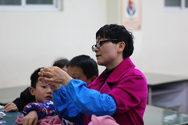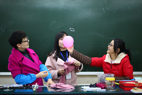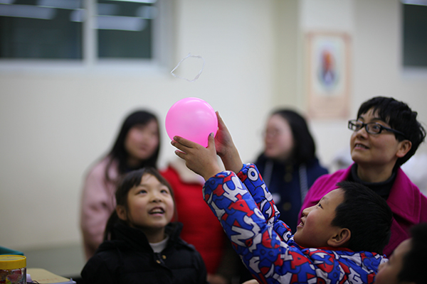 老师们用毛巾摩擦了塑料圈和气球以后,塑料圈开始在气球上跳舞了