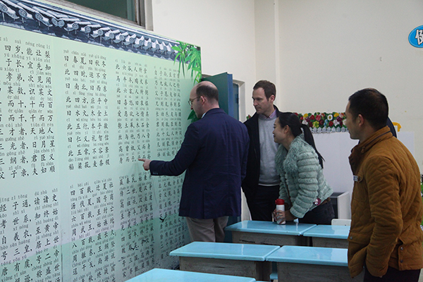 布莱登学校的代表对教室的布置非常感兴趣,认起了汉字