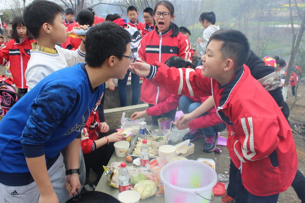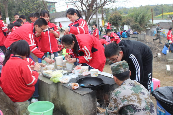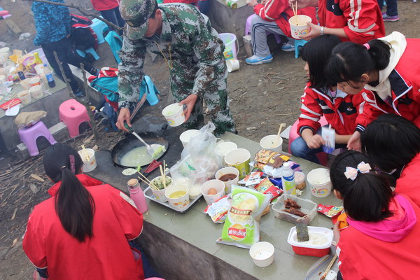 上午的练习一结束,同学们就在教官的帮助下,刷锅洗碗准备做饭。基地为同学们提供了野炊的相关用具,几人一个小组,自己做饭。你洗菜,我烧柴,简简单单一顿饭。虽然味道差异很大,但孩子们仍然不知疲倦,兴趣盎然!