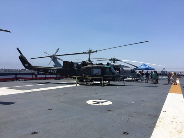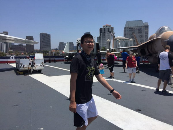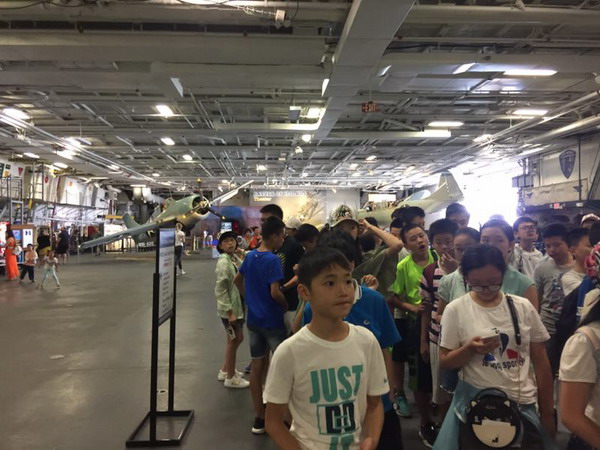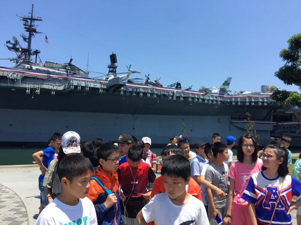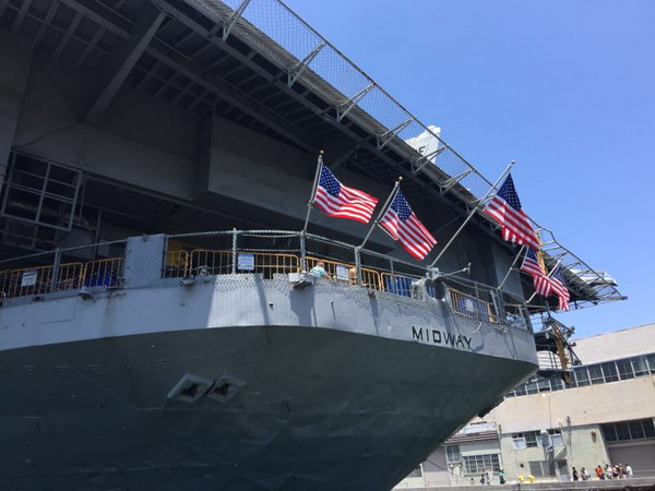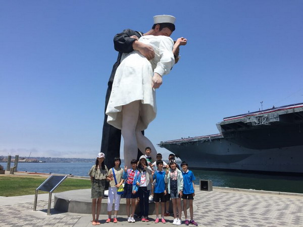 美国当地时间7月11日,我们来到了美丽的海滨城市圣地亚哥。圣地亚哥位于美国西海岸,是天然良港同时也是美国重要的军事基地,扼控太平洋东部海域,地理位置十分重要,也是众多旅游者的向往之地。海边停靠的航空母舰及众多军舰,在太阳的照耀下显得格外引人注目!在诸多军舰旁有一座雕像——世纪之吻。据说1945年,美国人民从广播中听到二战结束的消息,一位水手和一位白衣护士萍水相逢,深情的相吻,正好被摄影师捕捉下来,因此,被誉为“世纪之吻”。进入纪念中途岛海战而命名的中途岛号航母内部,封闭的停机仓内停放着一架架飞机,气势庞大,演示着曾经的辉煌。我们徐徐登上甲板,更为庞大的战斗机停在甲板上,气宇轩昂,仿佛是一个个即将开拔的战士,保卫着国家的安全。虽然它们不再天空翱翔,但是依然可以想象出它们在蔚蓝的天空,威风凛凛的样子。虽然中途岛号已不在启动,仅供人参观,但它曾经保卫了国家,带来了现在的和平!
