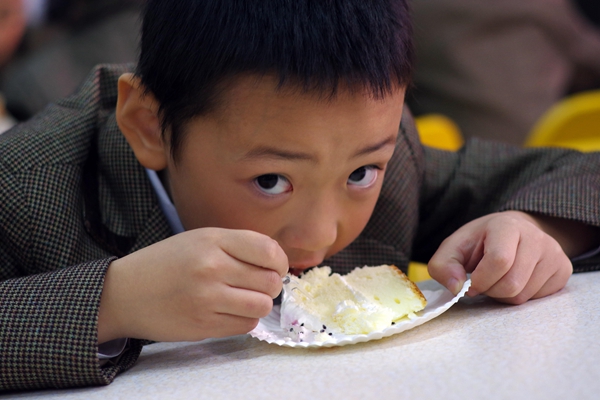 Share delicious cake! Make a pose, act cute. It is so sweet!