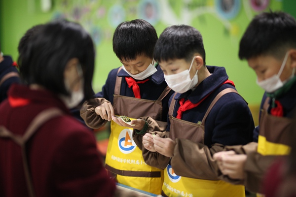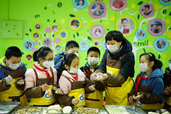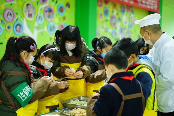 梅校长和同学们一起包饺子