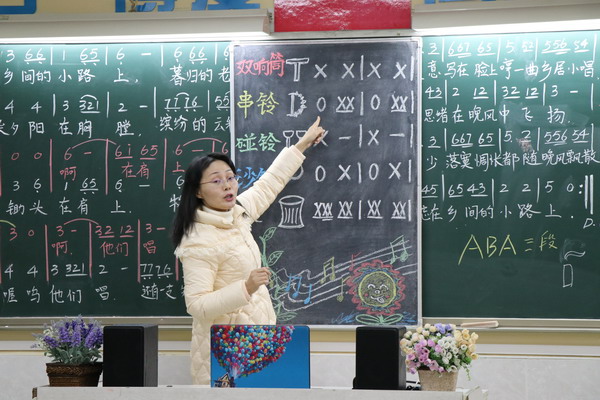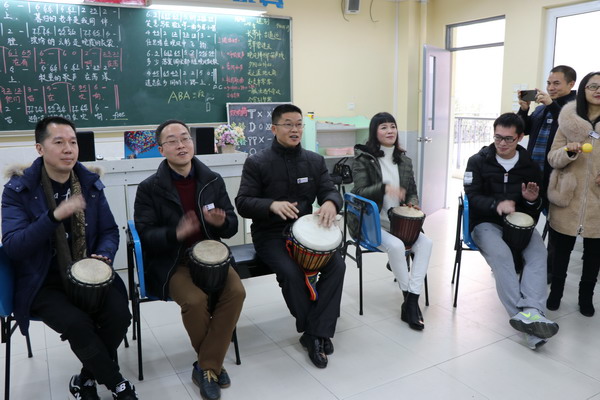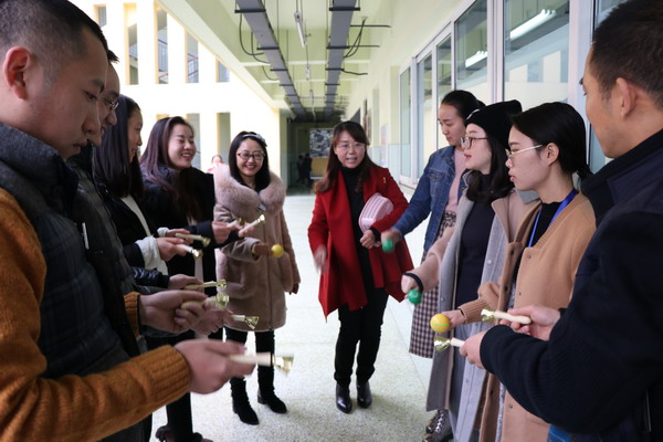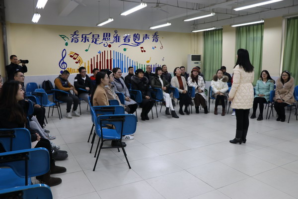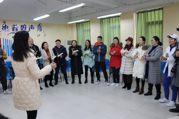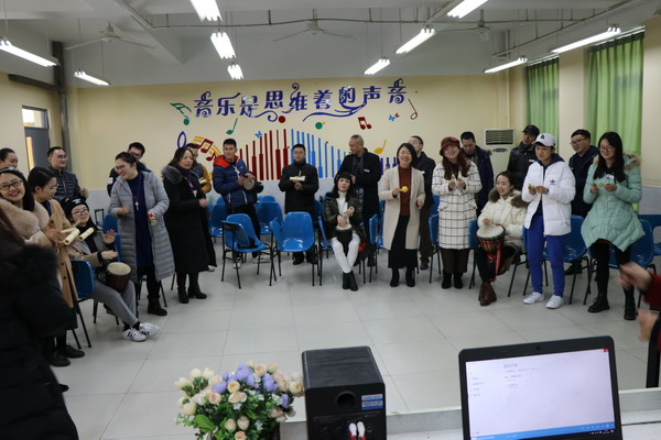 由音乐组老师们共同执教的教师课堂开始啦!今天,这里只有认真的音乐老师和可爱的“小学生”。在老师的引领下,同学们从对音乐的感知、体验,模仿、探究再到表现,创造,大家一步一步参与体验音乐活动的成功和快乐。真实的体验,让我们真正去看见学生内心,并以学生的视角来指导今后的教育教学实践。