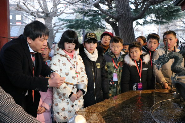 导游哥哥向同学们讲解日本国人礼佛前的“三净”