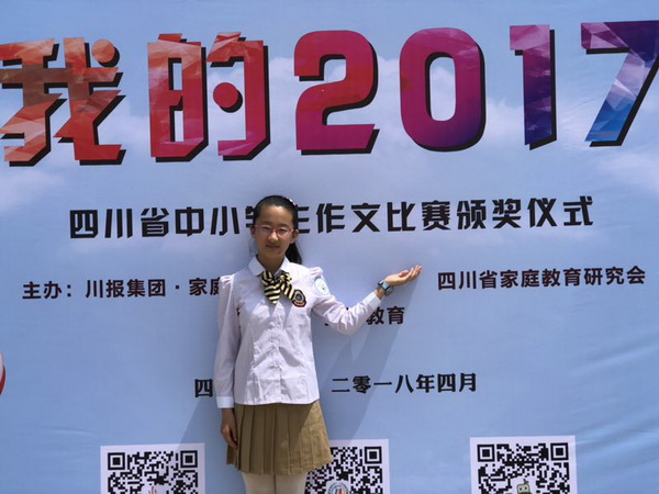 4月21日,在川报集团、《家庭与生活报》、四川省家庭教育研究会联合举办的“我的2017”四川省中小学作文比赛中,我校共有6名同学获奖,学校荣获“优秀组织奖”。