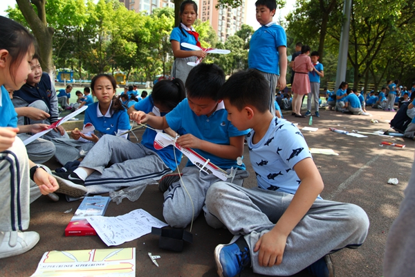 Children enjoyed this activity happily. Children struggled corporately and cooperated by dividing the work; Some students put the fuselage together, some students put the airfoil together, some students installed the rubber string and some students stuck the paste. The assembling of the model was soon finished.