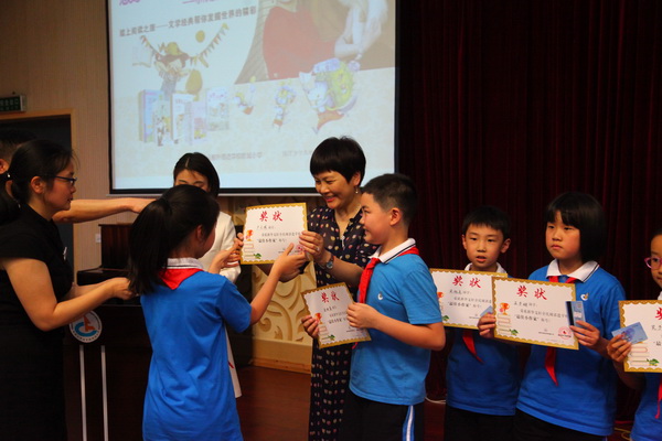 “笨狼妈妈”给获得新华文轩全民阅读进学校“最佳小作家”奖的同学颁奖