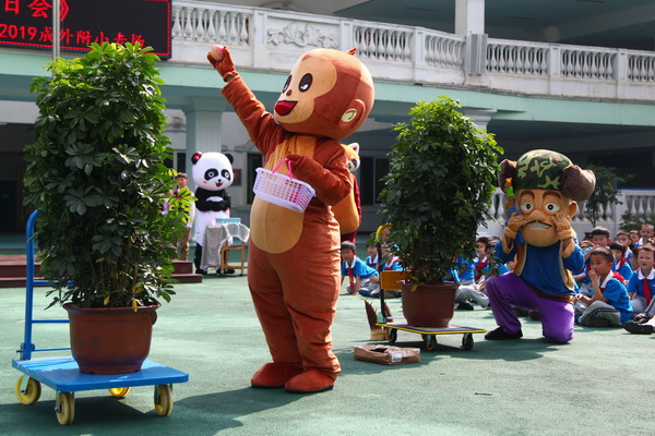 4月22日,我校举行第十周集体朝会。今天,我们成外附小来了几位可爱的小伙伴,他们是大熊猫‘兜兜’,和她的几位好朋友。还有几位来自成都大熊猫繁育研究基金会的老师,他们要利用今天的集体朝会,给我们讲解“熊猫讲堂”的知识。和大熊猫生活在同一个地方的野生动物们,有些因为生活的栖息地遭到人类的破坏以及对野生动物的猎杀,数量越来越少。我们都应该保护这些濒临灭绝的动物们。那么,我们该怎么做呢?使用公共交通出行,注意垃圾分类,拒绝使用一次性物品,拒绝野生动物制品,爱护我们的生活环境,保护大自然,让我们的地球变得更加美丽!