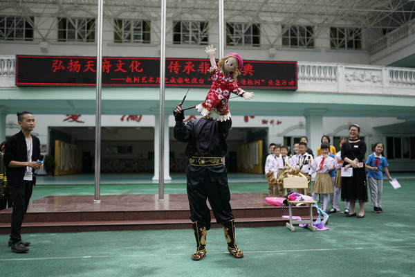5月20日,成都电视台《熊猫星视界》栏目组走进我校,给同学们带来了“非遗文化进校园”的公益活动。四川省非物质文化遗产目录(成都木偶戏)传承人罗兴康老师给同学们带来了精彩的木偶戏表演。文化是一种创造,也是一种选择。留住传统,就是留住了历史,就是保存了文化的命脉。学校是非遗文化传承的沃土,保护非物质文化遗产、传承民族文化基因,守望家园是我们共同的责任。