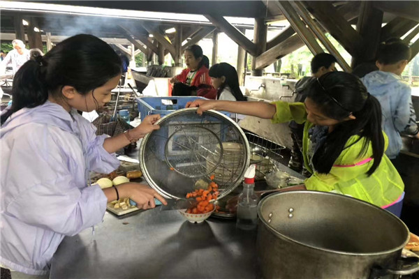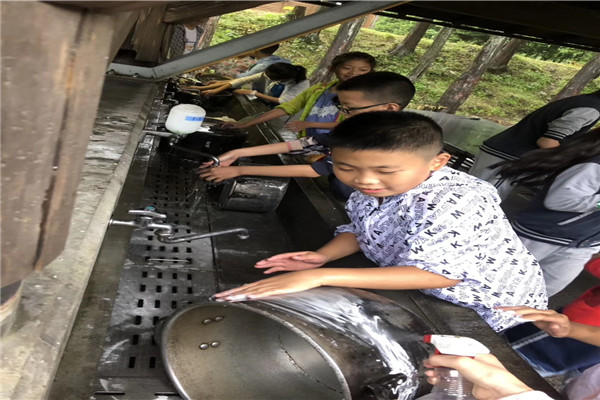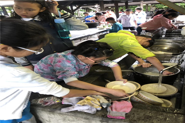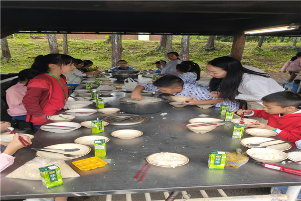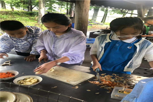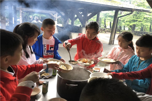 第二天,在营地的生活就正式开启了。在专业教练的指导下,上午的任务是,以小组为单位在指定区域寻找一定数量的食物卡,然后通过食物卡领取食材,再就地取材完成我们的终极任务,自己制作午餐----咖喱鸡肉饭。(搭灶台、取柴、生火、洗菜、切菜、煮饭、煮咖喱、添饭、洗碗、洗锅、擦桌子、扫地、收凳子、归位所有用具……孩子们分工明确、团结合作,一切都进行得井然有序。)