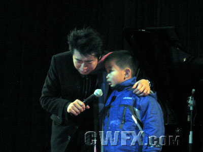 我校一年级的小钢琴手和郎朗一起在舞台上。