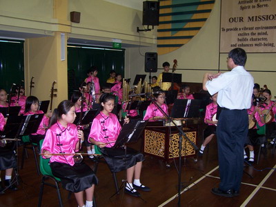 两校师生观看文艺表演:这是醒南小学的华乐队在表演中华传统曲目。