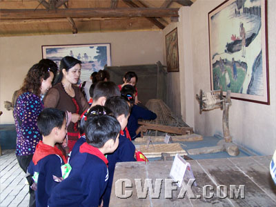 来到“草舍”,孩子们看到了许多从未见过的农具。