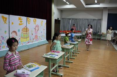 今天晚上,一年级为所有最近两个月过生日的孩子们举办了一场隆重的生日晚会。所有的孩子们都穿戴一新,过生日的孩子还戴上了美丽的皇冠。在这台生日晚会上,成都市工业学校健美操队的大姐姐们给小朋友们带来了充满活力的健美操,四年级的小姐姐们带来了美丽的孔雀舞。最了不起的是,一年级的小宝贝们才上学几天,已经在老师的指导下表演了“十个印第安小男孩”、“印度舞”等节目, 两个小主持人也是从一年级的小朋友中选出来的,所有的演员都赢得了老师和同学们的热烈掌声。