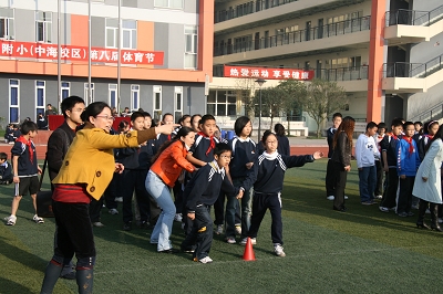 混合迎面接力赛开始了,你看老师们比参加比赛的同学还要激动。