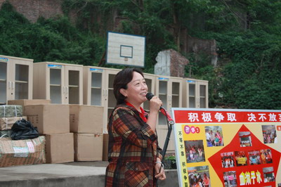 岷江音乐的负责人致辞并向灾区师生捐赠书柜。