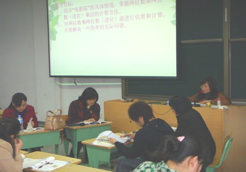 3月1日(星期一)下午,金牛区教研室在北站小学举办了一次全区三年级数学教师的教材培训会。会上,由我校三年级数学组五位老师展示了我校平时集体备课中的一次教研活动,着重就三年级下册教材中“乘法”一单元的内容编排和教学策略上的一些预设进行了探讨。大家围绕主题,踊跃发言,切磋教法、学法,并达成了共识。在整个约40分钟的过程中,现场安静,大家心情愉悦。浓厚的教研氛围得到了教研员曾辉老师的首肯及其他与会老师的赞同。曾辉老师表扬我校教师的教研方式好,研讨效果不错,他说:“在这样的教研氛围中青年教师会成长得很快,这样的氛围是学校整体教学质量的有力保障。”
