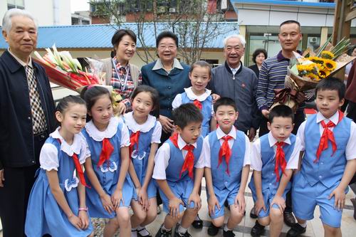 顾秀莲、四川省老干部与学校领导及献花孩子合影
