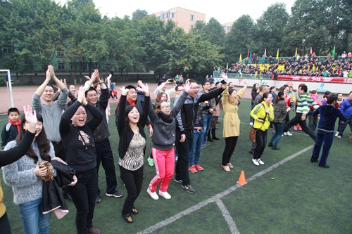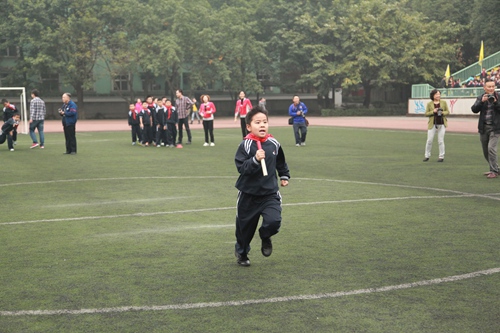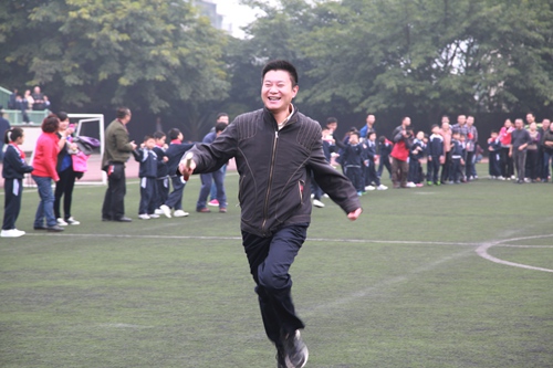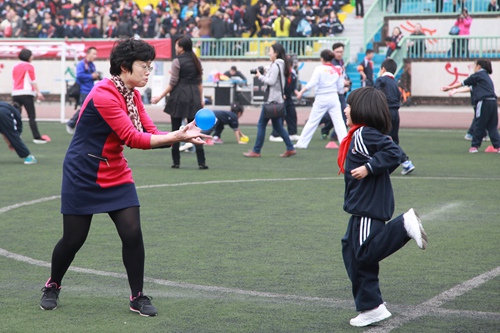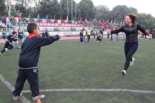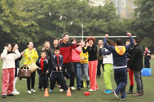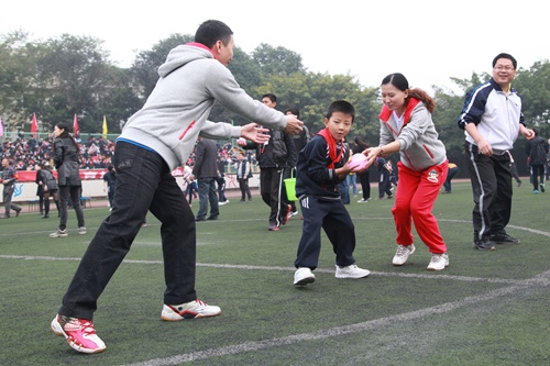 和老师、爸爸妈妈一起进行迎面接力赛