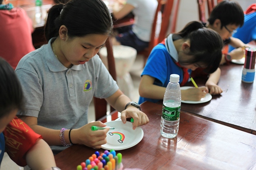 美术老师带领大家一起在纸盘上画画