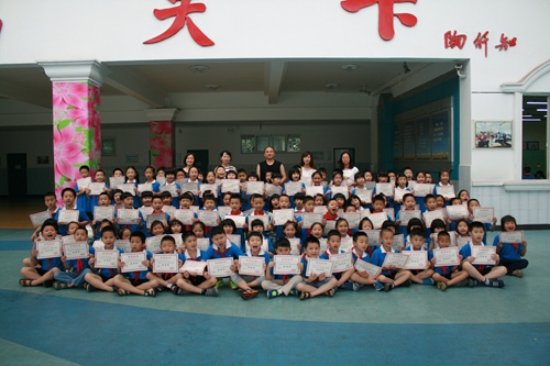 艾老师宣布在放飞梦想纸飞机比赛和金牛区中小学艺术调研比赛中获奖同学名单