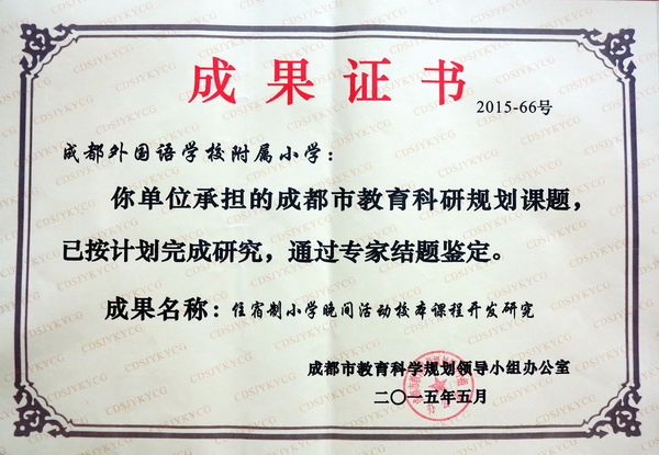2011年12月5日,由我校独立承担的成都市教育科学规划课题《住宿制小学晚间活动校本课程开发研究》正式立项。在三年多的研究过程中,课题组围绕研究目标,扎实开展研究工作,圆满完成了研究任务,达成了研究目标。经过成都市教育科学规划办组织相关专家的鉴定,这一课题目前已顺利结题。