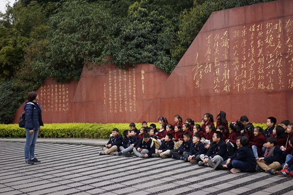 孩子们一早乘坐大巴从学校出发到达草堂