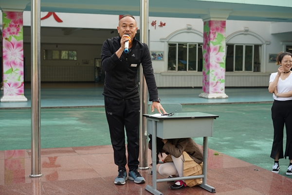 张勇老师示范地震来临时的躲避方法,讲解各班疏散路线