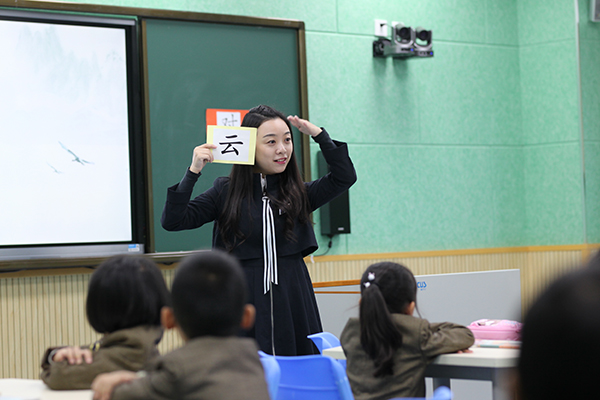 教研活动第一环节是栾珏老师课堂教学展示。栾珏老师执教一节识字课《对韵歌》,将识字教学与朗读指导相结合,将文化韵味和诗情画意融入其中。
