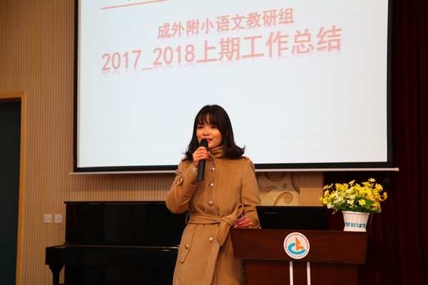 2018年1月17日下午,成外附小2017-2018学年度上期语文教研组工作总结大会在学校阶梯教室进行,学校领导梅校长、曾校长、章主任、黄主任及全体语文教师参加了此次会议。在本期的工作中,语文组的工作可圈可点:状态先行,实干兴校——优良的状态,实干的作风,决定了团队工作的基本面貌;整体优秀,成果丰硕——每一项工作,都因为“附小出品”,定义下潜在的品质标准;青苗茁壮,长势喜人——青年教师虚心好学,勤学苦练,让我们看到附小未来的希望!