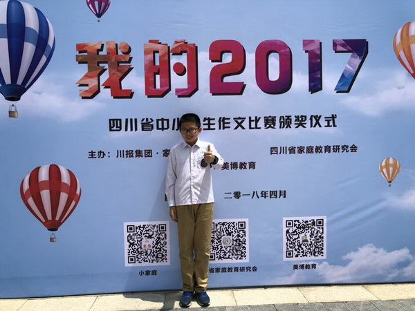 4月21日,在川报集团、《家庭与生活报》、四川省家庭教育研究会联合举办的“我的2017”四川省中小学作文比赛中,我校共有6名同学获奖,学校荣获“优秀组织奖”。