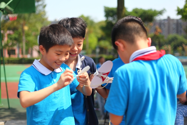 Children enjoyed this activity happily. Children struggled corporately and cooperated by dividing the work; Some students put the fuselage together, some students put the airfoil together, some students installed the rubber string and some students stuck the paste. The assembling of the model was soon finished.