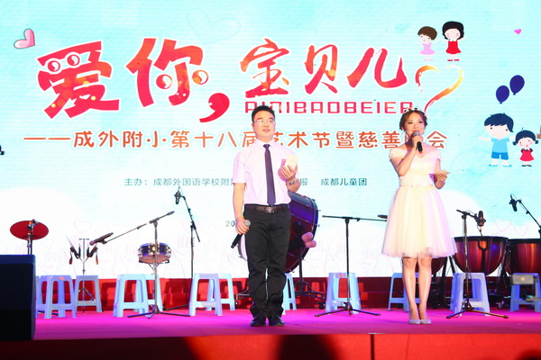 5月29日,我校隆重举行“成外附小第十八届艺术节暨慈善晚会”。我们通过爱心义卖,来征集善款。将义卖所得款项9万余元全部捐赠于成都大熊猫繁育研究基金会,用于大熊猫和濒危动物的保护,奉献自己的一片爱心。我们以慈善晚会的方式,来表达爱,我爱着你,你爱着我,我们在一起很幸福。
