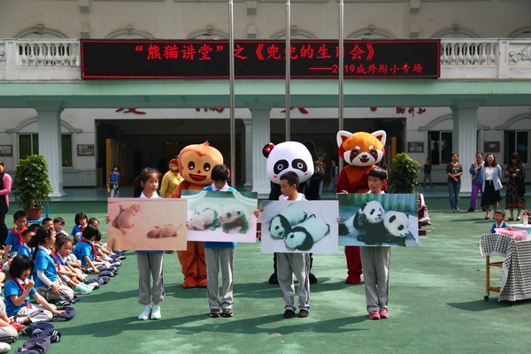 4月22日,我校举行第十周集体朝会。今天,我们成外附小来了几位可爱的小伙伴,他们是大熊猫‘兜兜’,和她的几位好朋友。还有几位来自成都大熊猫繁育研究基金会的老师,他们要利用今天的集体朝会,给我们讲解“熊猫讲堂”的知识。和大熊猫生活在同一个地方的野生动物们,有些因为生活的栖息地遭到人类的破坏以及对野生动物的猎杀,数量越来越少。我们都应该保护这些濒临灭绝的动物们。那么,我们该怎么做呢?使用公共交通出行,注意垃圾分类,拒绝使用一次性物品,拒绝野生动物制品,爱护我们的生活环境,保护大自然,让我们的地球变得更加美丽!