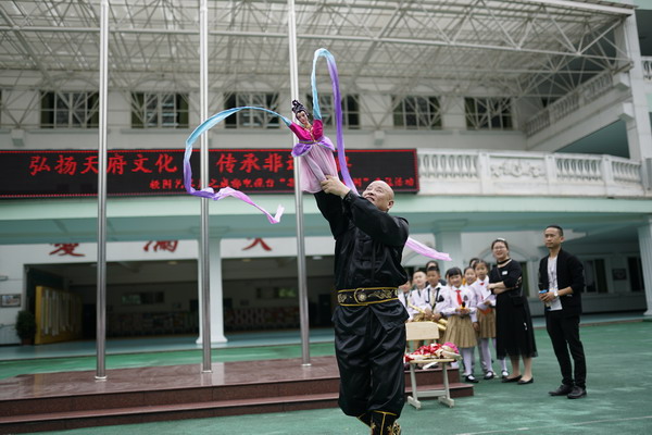 5月20日,成都电视台《熊猫星视界》栏目组走进我校,给同学们带来了“非遗文化进校园”的公益活动。四川省非物质文化遗产目录(成都木偶戏)传承人罗兴康老师给同学们带来了精彩的木偶戏表演。文化是一种创造,也是一种选择。留住传统,就是留住了历史,就是保存了文化的命脉。学校是非遗文化传承的沃土,保护非物质文化遗产、传承民族文化基因,守望家园是我们共同的责任。