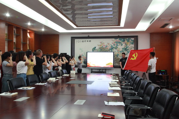 全体党员在党旗前庄严宣誓,重温誓词,牢记党员使命。