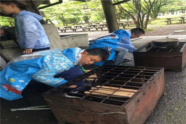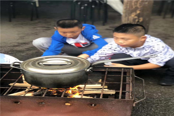 第二天,在营地的生活就正式开启了。在专业教练的指导下,上午的任务是,以小组为单位在指定区域寻找一定数量的食物卡,然后通过食物卡领取食材,再就地取材完成我们的终极任务,自己制作午餐----咖喱鸡肉饭。(搭灶台、取柴、生火、洗菜、切菜、煮饭、煮咖喱、添饭、洗碗、洗锅、擦桌子、扫地、收凳子、归位所有用具……孩子们分工明确、团结合作,一切都进行得井然有序。)