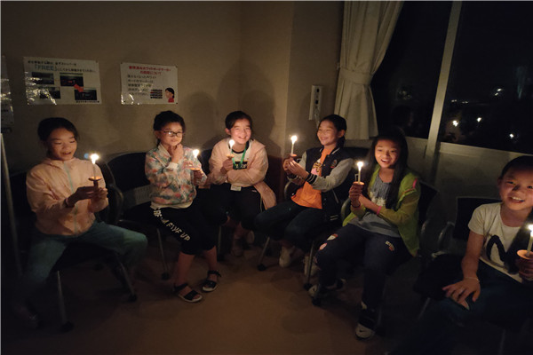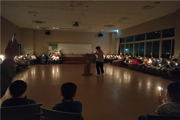 到了晚上,教练还给我们安排了丰富多彩的烛光晚会,让我们心旷神怡。最后一首《成都》,使其达到高潮,也是我们对全世界人民的祝福……