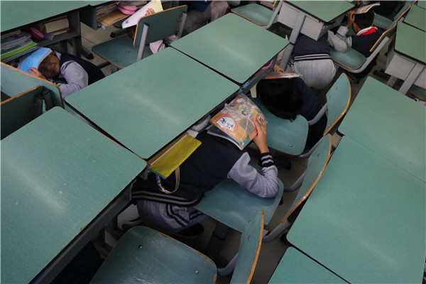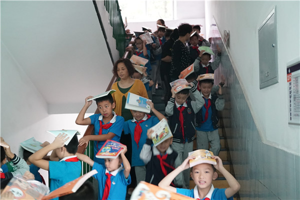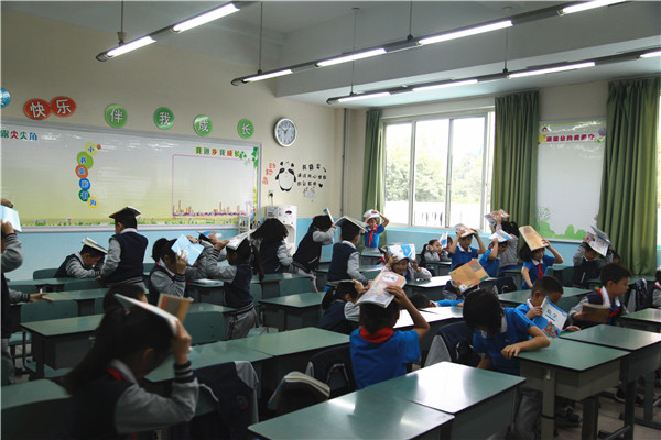 演练一开始,师生就近蹲在课桌墙角,并用书本等重物保护好头部。