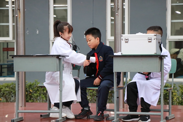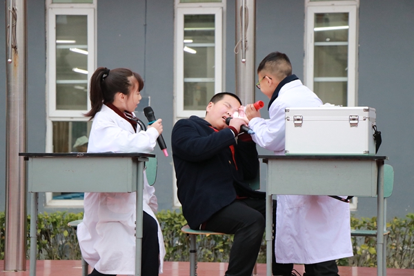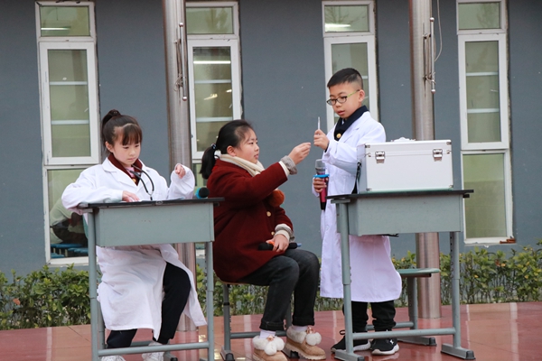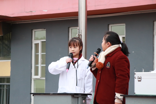 四五六年级,五年级八班的小演员扮演医生和患者,用情景剧的方式,生动形象地向同学们介绍了秋冬常见疾病。精彩的情景剧表演引人入胜,同学们看得笑声连连;疾病防控的知识贯穿其中,孩子们边看表演边学习。流行性感冒、红眼病和呕吐病等疾病都是冬季常见疾病。小医生现场给大家讲解了产生原因和预防方法。提醒同学们在平时一定要加强锻炼,吃熟食,喝热开水,注意个人卫生。
