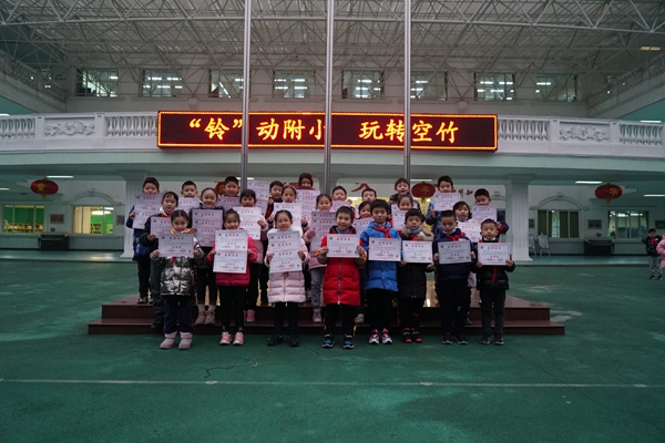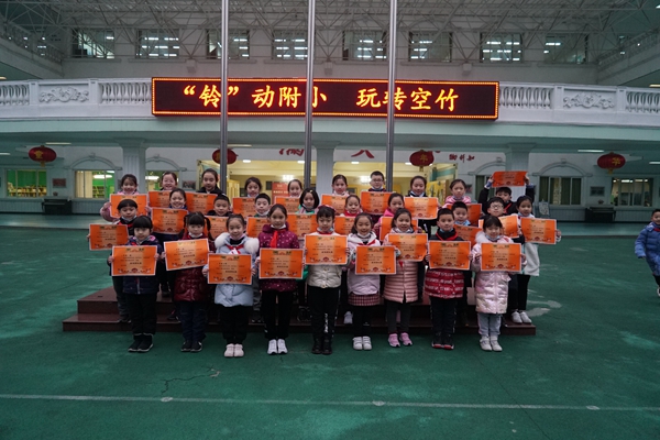德育处艾主任,黄老师在启动仪式中宣布,学校将会在体育课中开设“空竹教学课程”,附小的每一位孩子都将作为抖空竹非遗文化的传承人。接着,学校领导为参加“成都市第五届空竹大赛”的获奖同学颁发了荣誉。
