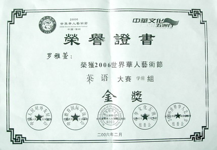 颁奖词:年龄虽小,却凭借自己的勤奋,以出色的英语表达,赢得了中国人民对外友好协会等单位组织的世界华人艺术节中“英语大赛”的金奖,可谓有志不在年高。