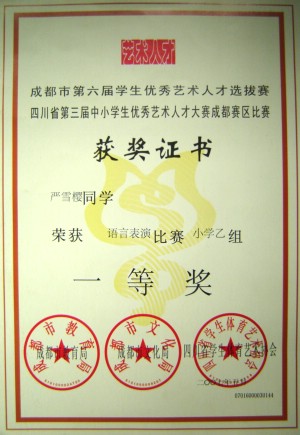 这几年来,在老师的教导下,我成了一名优秀的少先队员,全心全意地协助老师,真诚热心地服务同学。我还获得过许多奖项,比如:金牛区三好学生、成都市优秀艺术人才比赛语言表演一等奖、优秀小班主任、校级优秀学生干部……